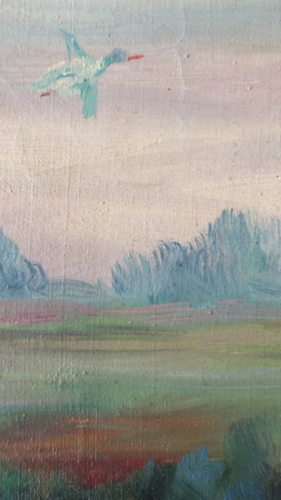 This large original vintage oil painting shows a calm river landscape with trees, open fields, and birds in flight under a soft pastel sky.