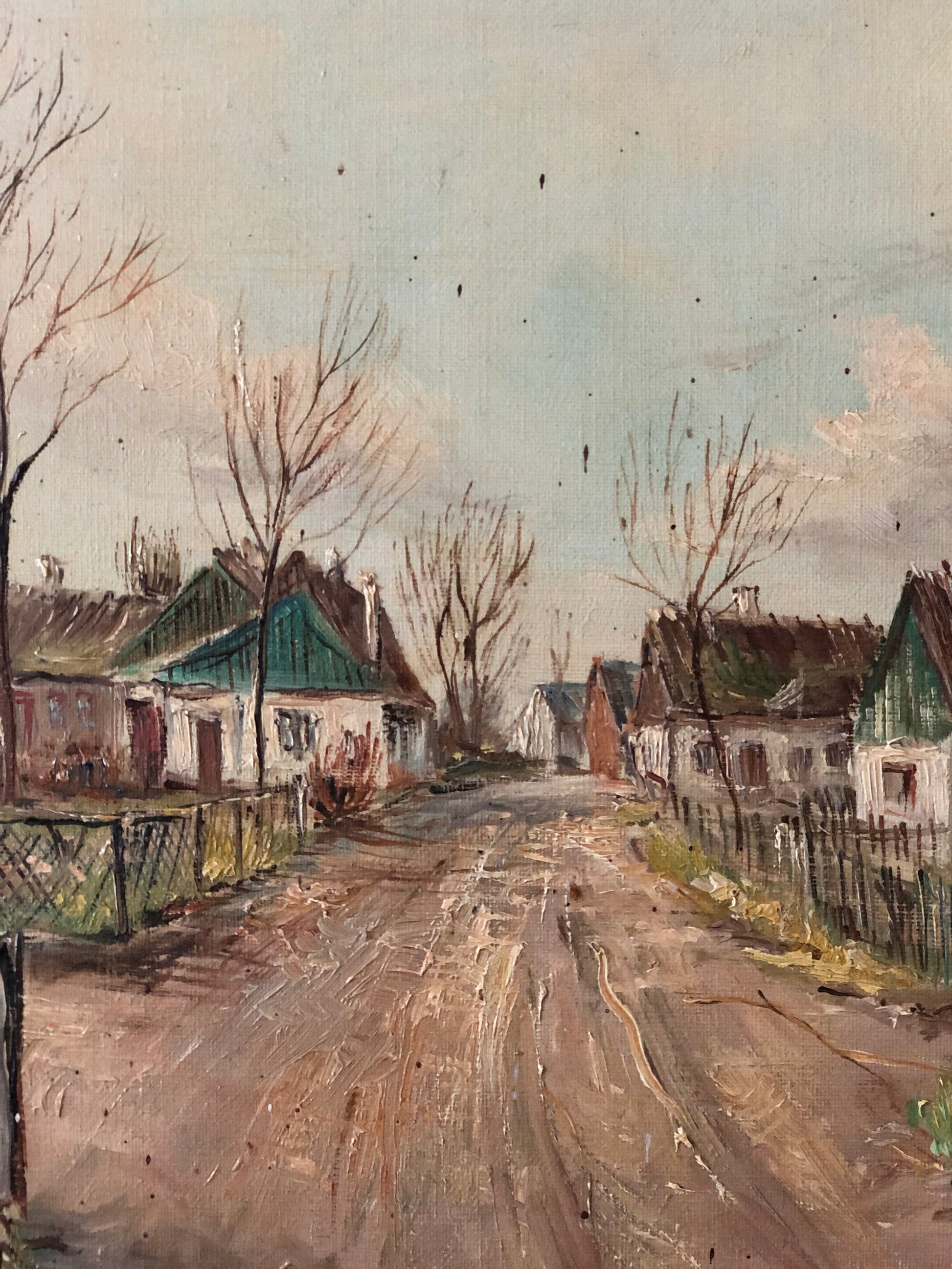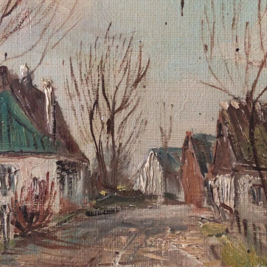 Large Vintage European Village Original Oil Painting with Cottages, circa 1940