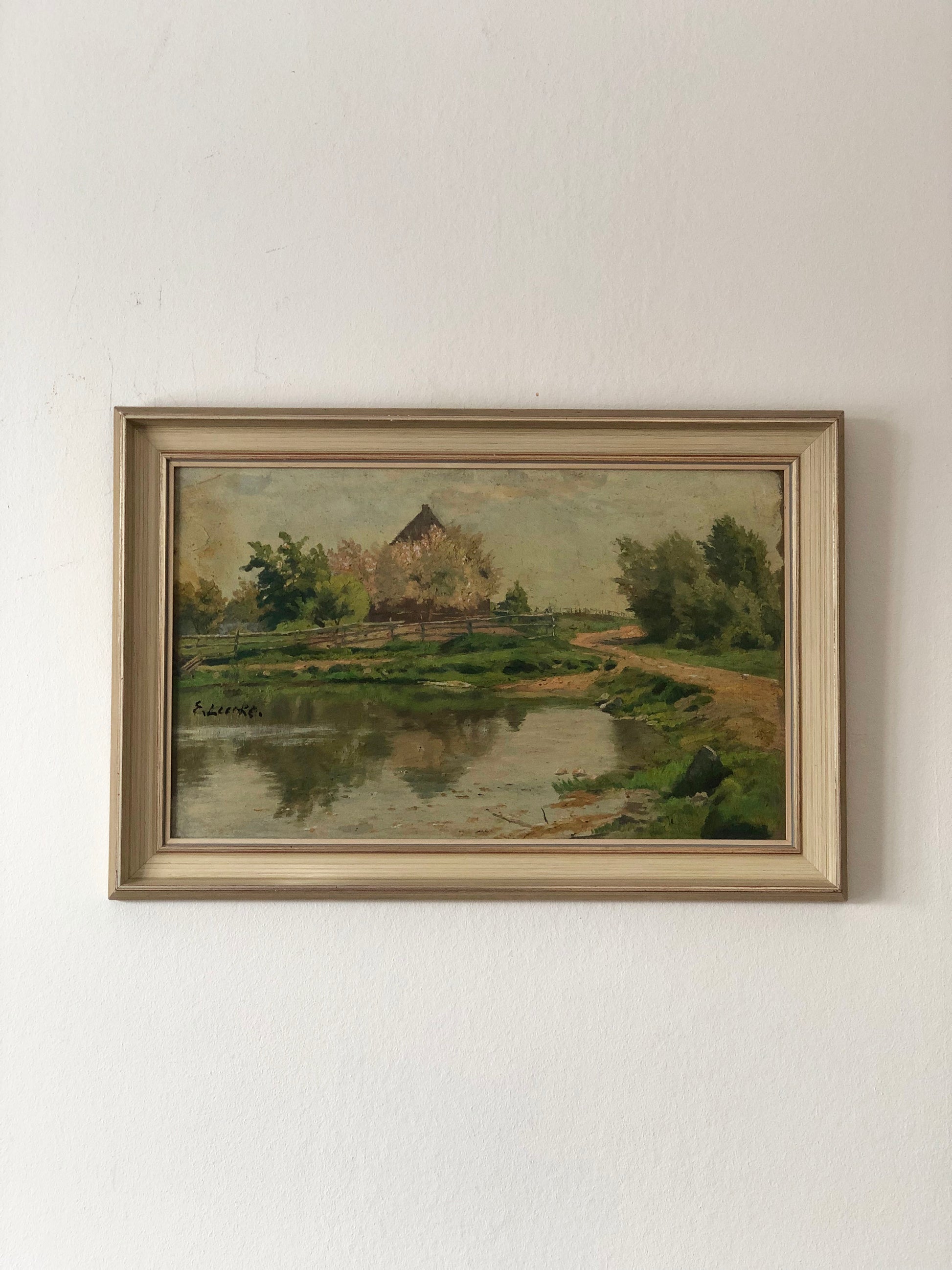 This original vintage oil painting shows a waterside cottage, with a sandy path and wooden fence, surrounded by trees and greenery. Soft natural colors create a calm, atmospheric countryside scene with reflections in the water.