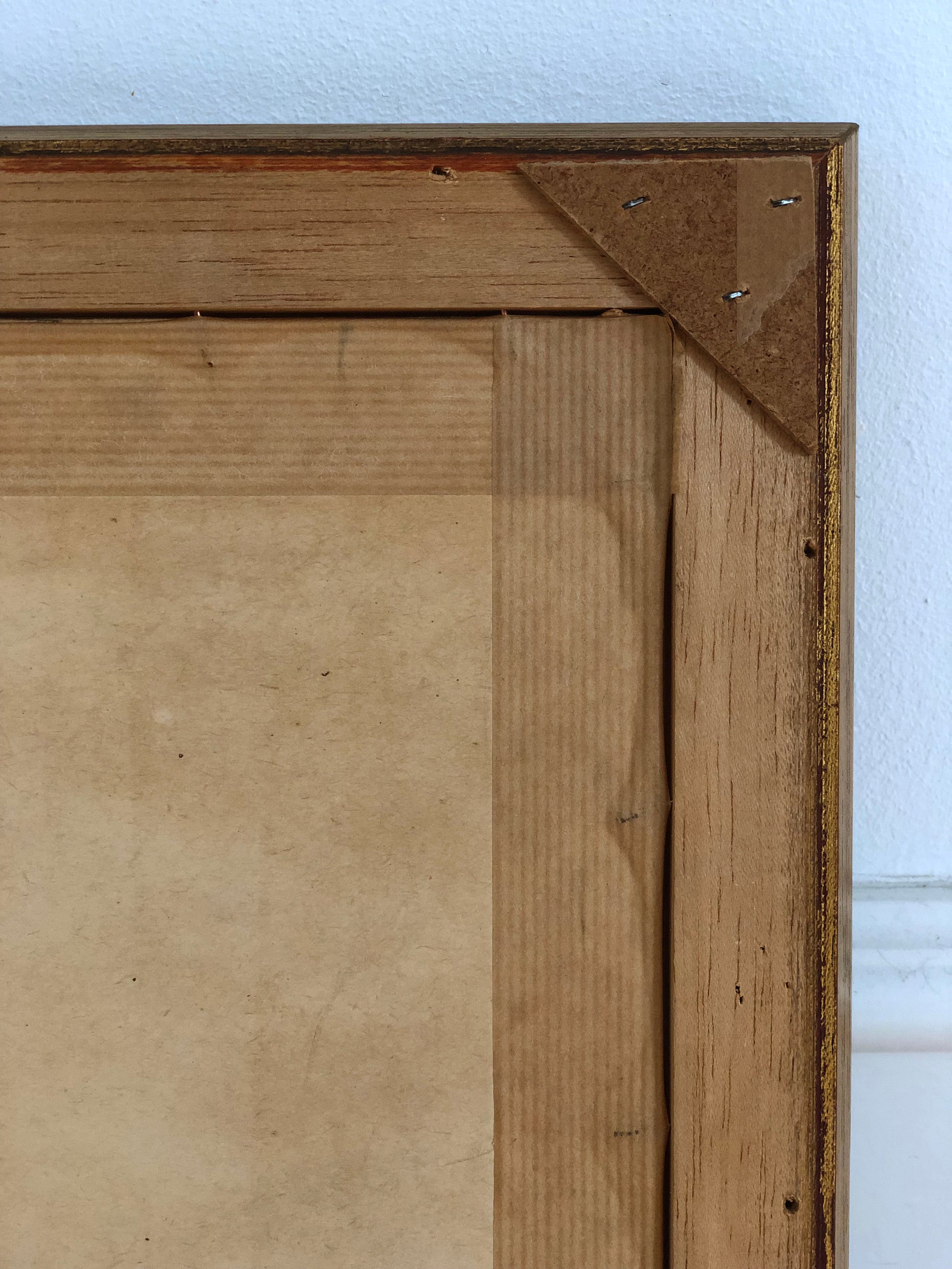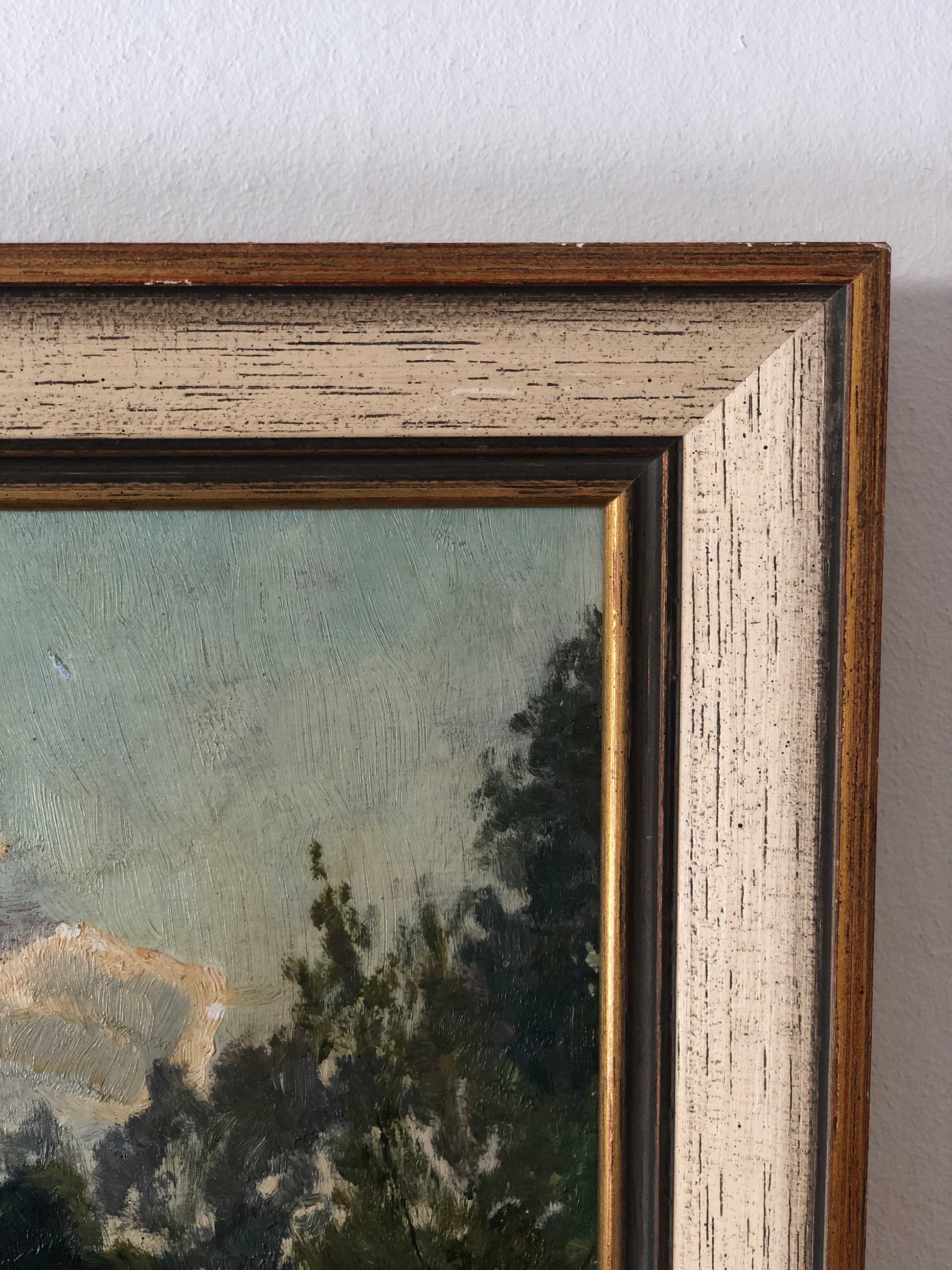The painting was later framed in the late 20th century in a cream-colored wooden frame with a gold outer edge and inner detailing. A warm and peaceful landscape with a soft, natural color palette that brings warmth and character to your living room, bedroom or hallway.