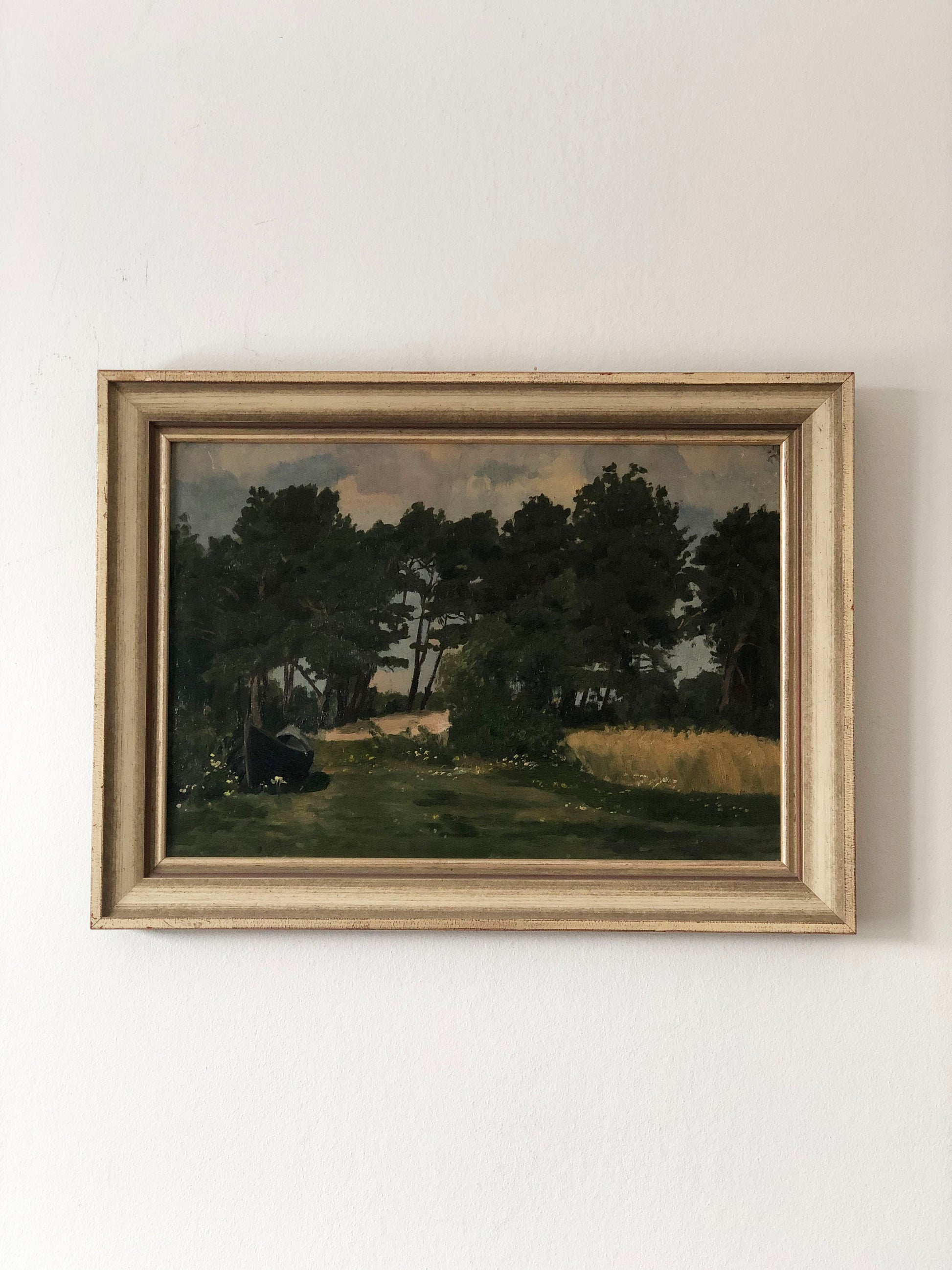 This original vintage oil painting shows a nature scene with tall trees, a grass field and a small rowboat resting under the trees. The natural green tones give the scene a calm nature character.