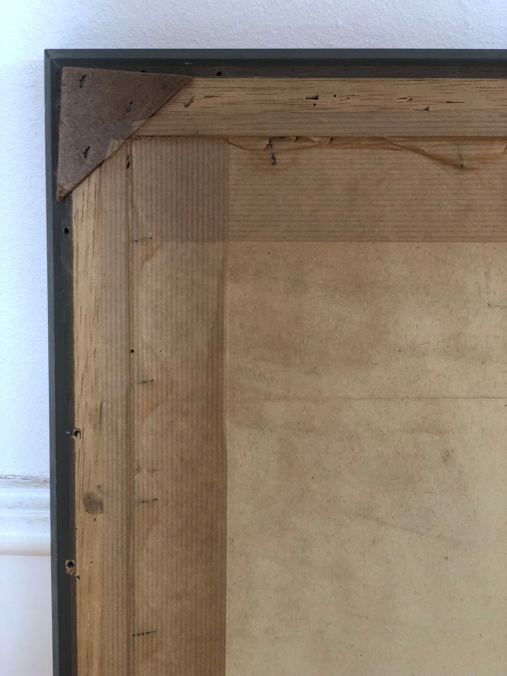 The painting was later framed in a late 20th century cream-colored wooden frame with a gold outer edge and inner detailing.